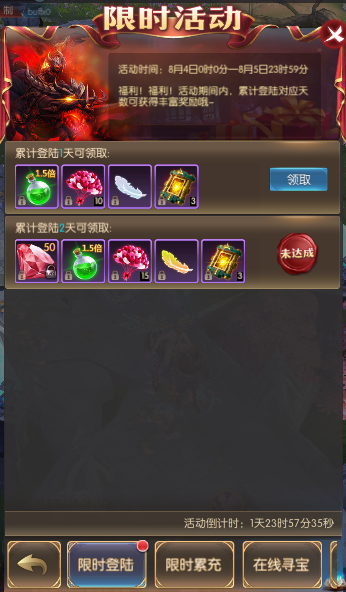 活动简介:福利!福利!活动期间内,累计登陆对应天数可获得丰富奖励哦~