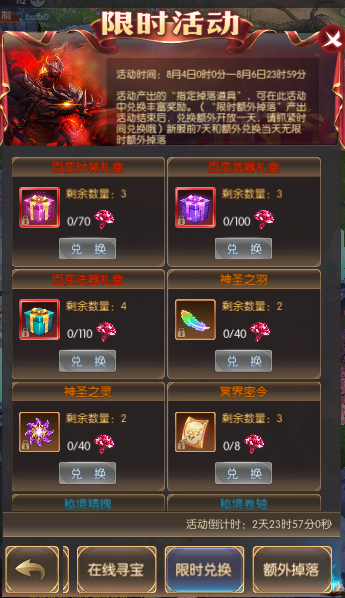 活动简介:活动期间,击杀250级以上世界boss、所有个人boss、冥界禁域、boss之家可额外掉落指定兑换道具,可在“限时兑换”活动中兑换丰富奖励;180级以上玩家野外挂机可额外掉落指定兑换道具,可在“限时兑换”活动中兑换丰富奖励