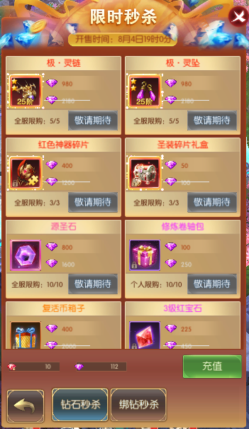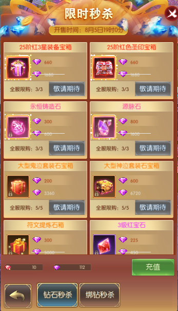 活动简介:活动期间,玩家能以超低的价格秒杀原价道具,机会不容错过。