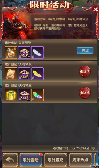 活动简介:福利!福利!活动期间内,累计登陆对应天数可获得丰富奖励哦~