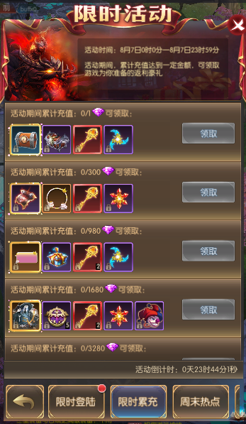 活动简介:活动期间,累计充值达到一定金额,可领取游戏为你准备的返利豪礼