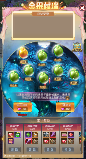 1.点击果树上的果子可以摘下果子,获得对应的奖励
