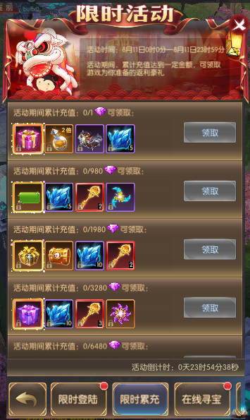 活动简介:活动期间,累计在线一定时常可获得寻宝次数,寻宝可获得珍稀奖励。寻宝次数每天零点重置。