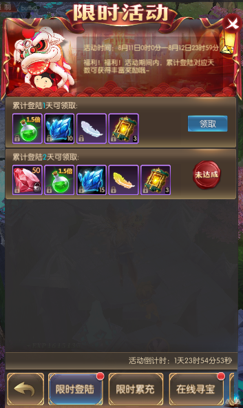 活动简介:福利!福利!活动期间内,累计登陆对应天数可获得丰富奖励哦~