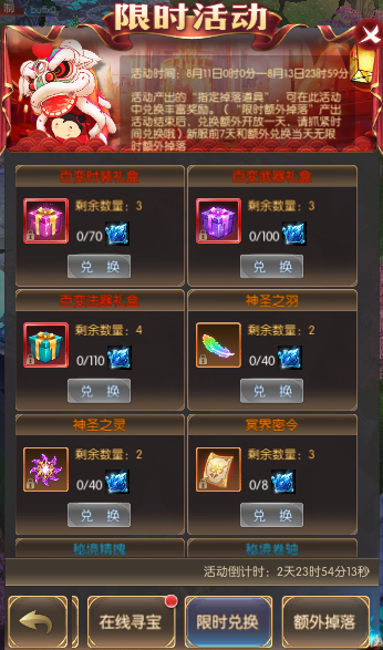 活动简介:活动期间,击杀250级以上世界boss、所有个人boss、冥界禁域、boss之家可额外掉落指定兑换道具,可在“限时兑换”活动中兑换丰富奖励;180级以上玩家野外挂机可额外掉落指定兑换道具,可在“限时兑换”活动中兑换丰富奖励