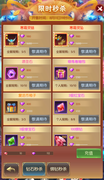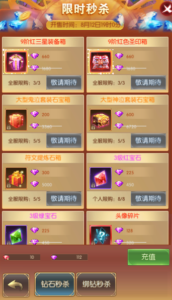 活动简介:活动期间,玩家能以超低的价格秒杀原价道具,机会不容错过。