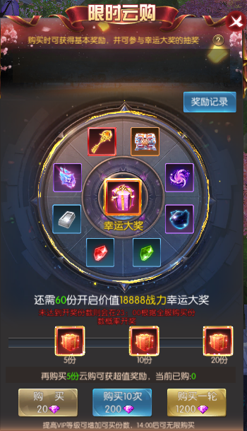2.云购活动10:00开启购买,在到达14:00之前,玩家可以购买一定份数的云购(可购买份数与VIP等级有关)