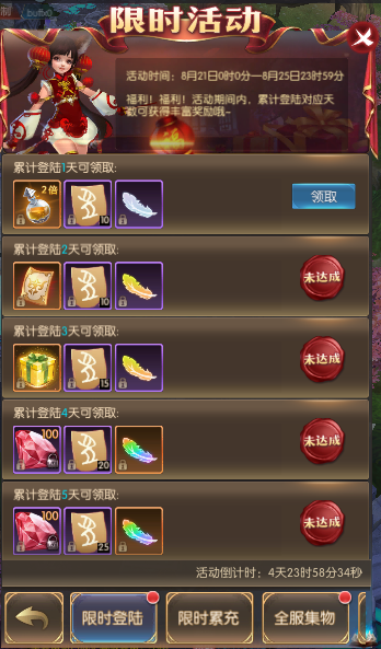 活动简介:福利!福利!活动期间内,累计登陆对应天数可获得丰富奖励哦~