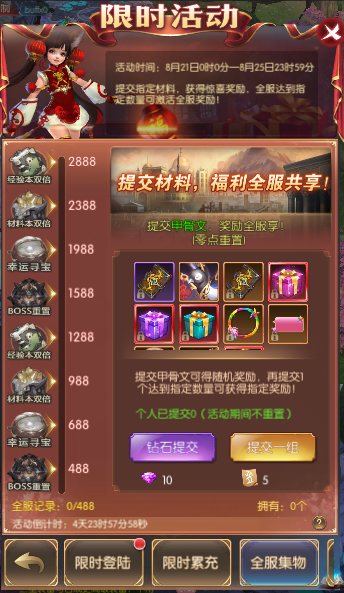 活动简介:提交指定材料,获得惊喜奖励,全服达到指定数量可激活全服奖励!