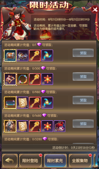 活动简介:活动期间,累计充值达到一定金额,可领取游戏为你准备的返利豪礼