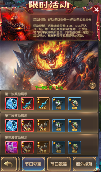 活动简介:活动期间每天14:00,19:30开各开一场。每一场总共刷新3波怪物,击杀怪物有获得高阶圣灵,同时会获得一定的活动积分,根据积分排名发放积分奖励。