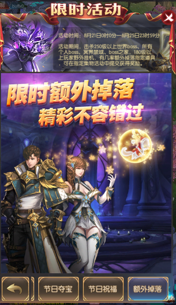 活动简介:活动期间,250级以上的世界boss,所有个人boss额外掉落贪图道具;250级以上世界boss、所有个人boss、冥界禁域、boss之家。180级以上玩家野外挂机有额外掉落指定道具,可在指定全服集物活动中提交获得奖励。