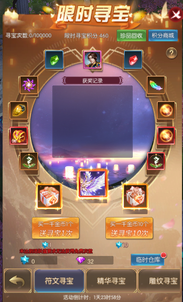 活动简介:进行寻宝即可获得丰厚奖励;限时寻宝时获得的积分,可在限时寻宝积分商城兑换珍稀道具,仅在限时寻宝开启时可使用,本次开启未用完的积分会保持到下次开启依旧可以使用