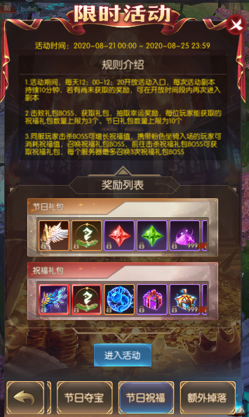 2.击败礼包BOSS,获取礼包,抽取幸运奖励,每位玩家能获取的祝福礼包数量上限为3个、节日礼包数量上限为10个