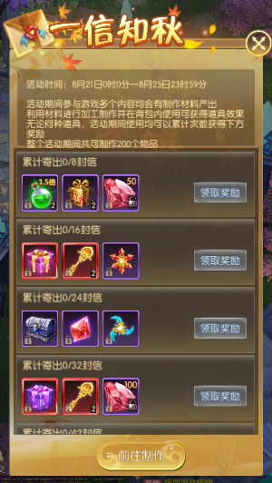 活动简介:活动期间参与游戏多个内容均会有制作材料产出,利用材料进行加工制作并在背包内使用可获得道具效果,无论何种道具,活动期间使用均可以累计次数获得下方奖励