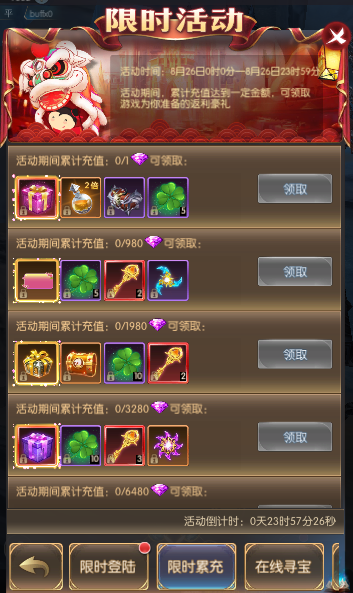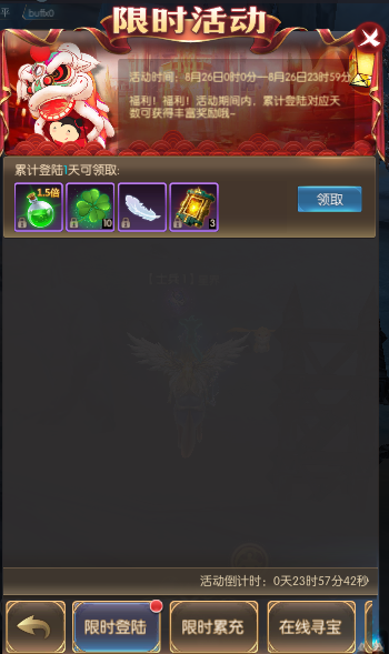 活动简介:活动期间,累计在线一定时常可获得寻宝次数,寻宝可获得珍稀奖励。寻宝次数每天零点重置。
