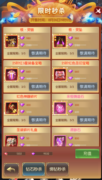 活动简介:活动期间,玩家能以超低的价格秒杀原价道具,机会不容错过。