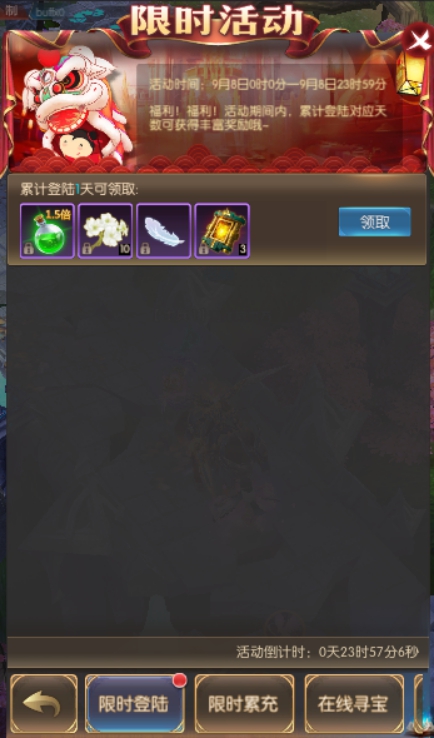累计登陆1天 | 1.5倍经验药水,梨花*10,自然之羽,梦幻通行证*3 |