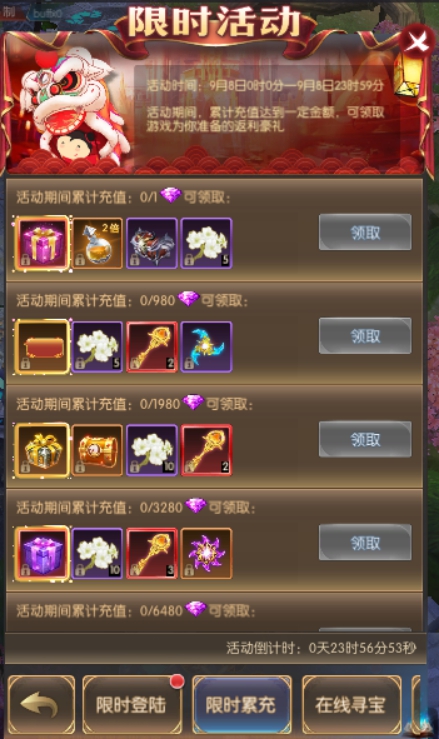 活动简介:活动期间,累计充值达到一定金额,可领取游戏为你准备的返利豪礼