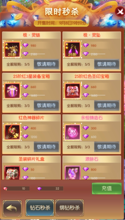 活动简介:活动期间,玩家能以超低的价格秒杀原价道具,机会不容错过。