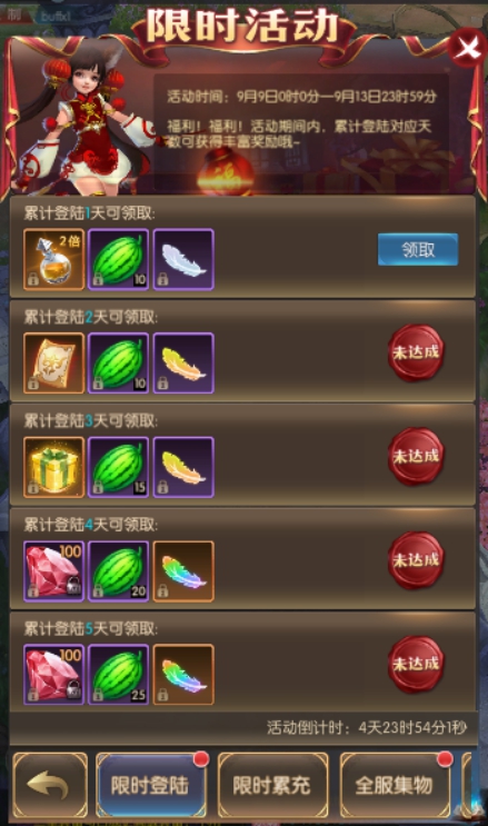 活动简介:福利!福利!活动期间内,累计登陆对应天数可获得丰富奖励哦~