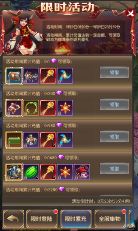 活动简介:活动期间,累计充值达到一定金额,可领取游戏为你准备的返利豪礼