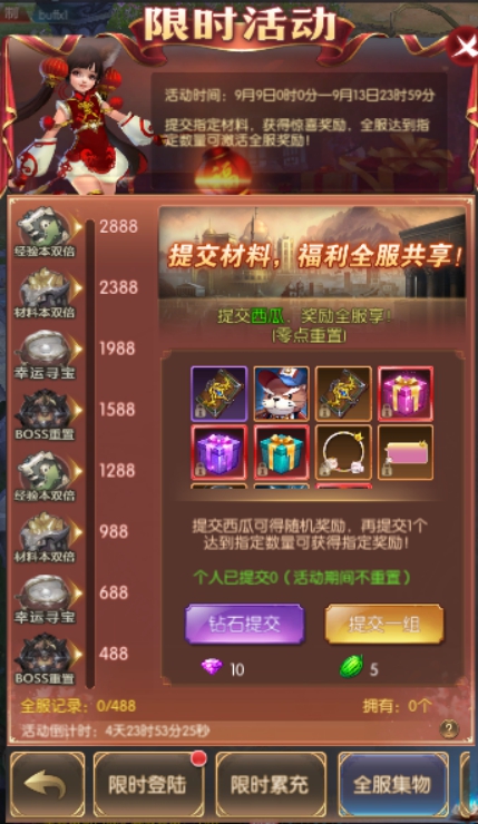 活动简介:提交指定材料,获得惊喜奖励,全服达到指定数量可激活全服奖励!