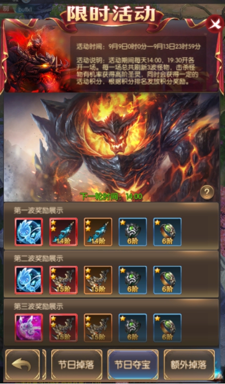 活动简介:活动期间每天14:00,19:30开各开一场。每一场总共刷新3波怪物,击杀怪物有获得高阶圣灵,同时会获得一定的活动积分,根据积分排名发放积分奖励。