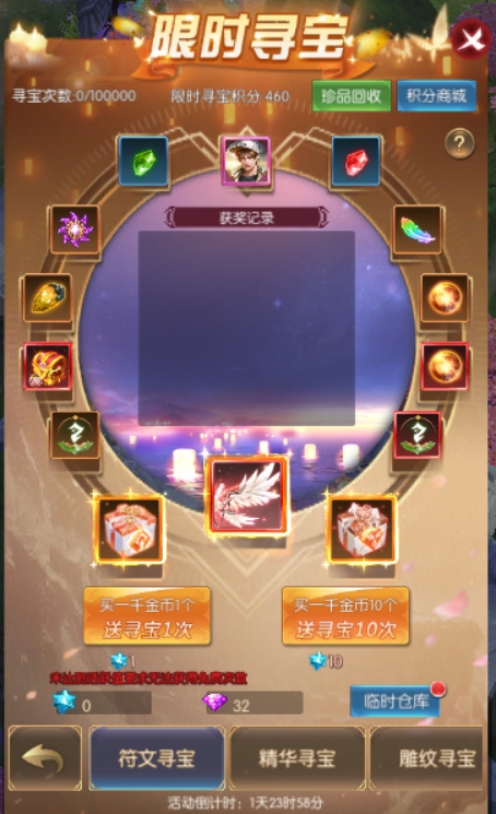 活动简介:进行寻宝即可获得丰厚奖励;限时寻宝时获得的积分,可在限时寻宝积分商城兑换珍稀道具,仅在限时寻宝开启时可使用,本次开启未用完的积分会保持到下次开启依旧可以使用