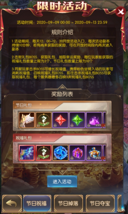 2.击败礼包BOSS,获取礼包,抽取幸运奖励,每位玩家能获取的祝福礼包数量上限为3个、节日礼包数量上限为10个
