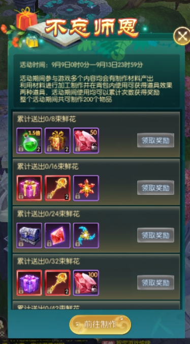 活动简介:活动期间参与游戏多个内容均会有制作材料产出,利用材料进行加工制作并在背包内使用可获得道具效果,无论何种道具,活动期间使用均可以累计次数获得下方奖励