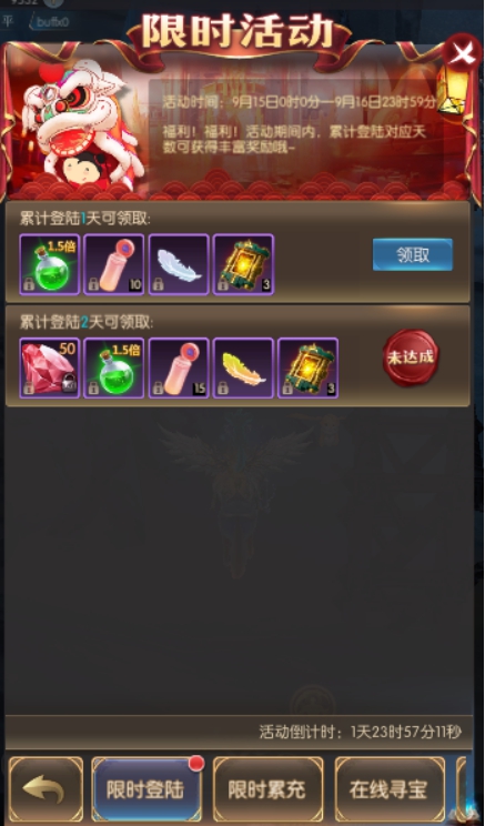 活动简介:福利!福利!活动期间内,累计登陆对应天数可获得丰富奖励哦~