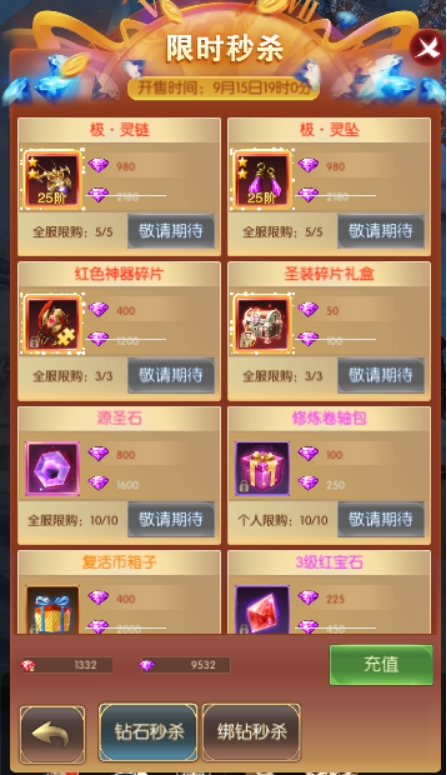 活动简介:活动期间,玩家能以超低的价格秒杀原价道具,机会不容错过。