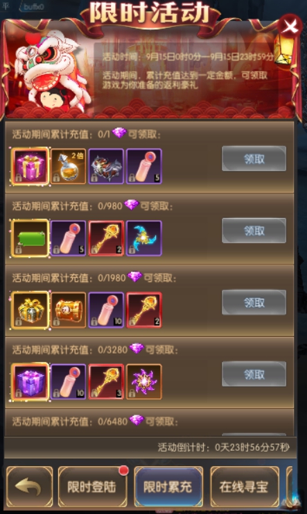 活动简介:活动期间,累计充值达到一定金额,可领取游戏为你准备的返利豪礼
