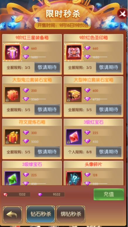 绑钻礼盒(内含绑钻300) | 个人限1 | 88 | 300 |