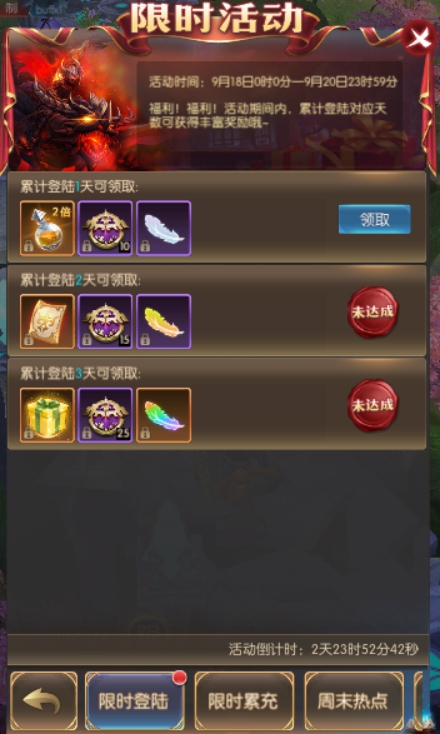 累计登陆3天 | 疲劳礼盒,热点*25,神圣之羽 |