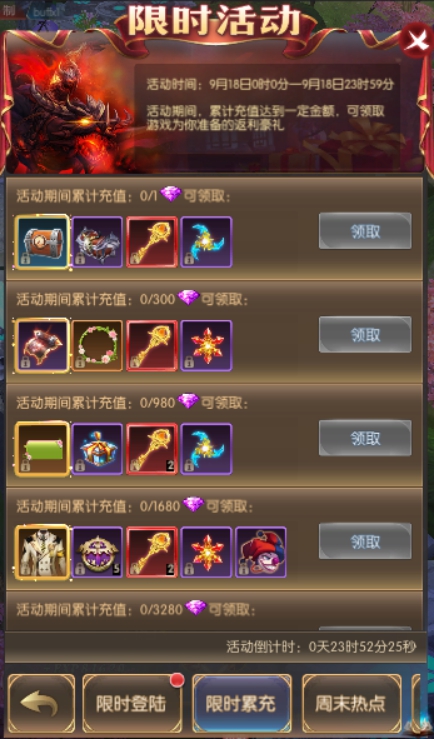 活动简介:活动期间,累计充值达到一定金额,可领取游戏为你准备的返利豪礼