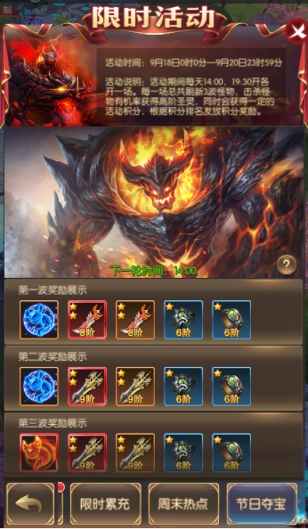 活动简介:活动期间每天14:00,19:30开各开一场。每一场总共刷新3波怪物,击杀怪物有获得高阶圣灵,同时会获得一定的活动积分,根据积分排名发放积分奖励。