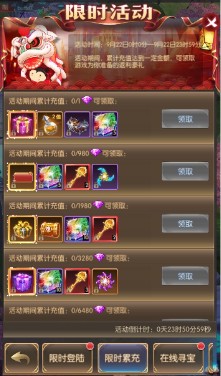 活动简介:活动期间,累计充值达到一定金额,可领取游戏为你准备的返利豪礼