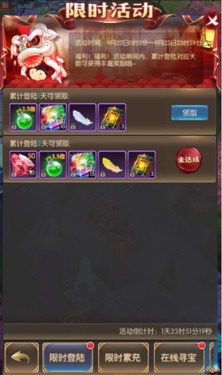 累计登陆1天 | 1.5倍经验药水,神秘地图*10,自然之羽,梦幻通行证*3 |