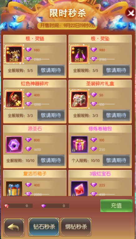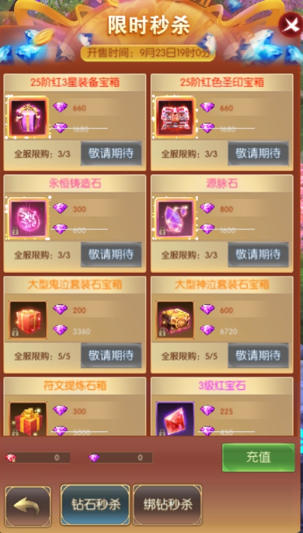 活动简介:活动期间,玩家能以超低的价格秒杀原价道具,机会不容错过。