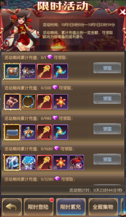 活动简介:活动期间,累计充值达到一定金额,可领取游戏为你准备的返利豪礼