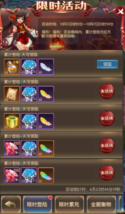 活动简介:福利!福利!活动期间内,累计登陆对应天数可获得丰富奖励哦~