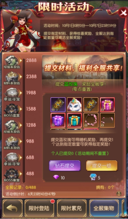 活动简介:提交指定材料,获得惊喜奖励,全服达到指定数量可激活全服奖励!