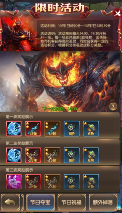 活动简介:活动期间每天14:00,19:30开各开一场。每一场总共刷新3波怪物,击杀怪物有获得高阶圣灵,同时会获得一定的活动积分,根据积分排名发放积分奖励。
