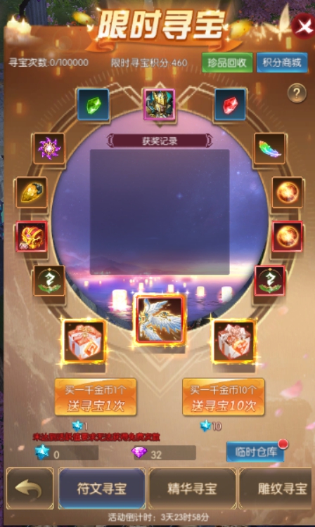 活动简介:进行寻宝即可获得丰厚奖励;限时寻宝时获得的积分,可在限时寻宝积分商城兑换珍稀道具,仅在限时寻宝开启时可使用,本次开启未用完的积分会保持到下次开启依旧可以使用