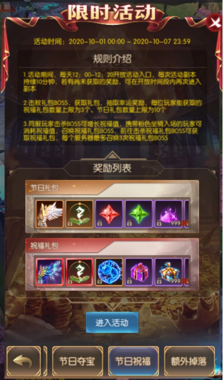 2.击败礼包BOSS,获取礼包,抽取幸运奖励,每位玩家能获取的祝福礼包数量上限为3个、节日礼包数量上限为10个