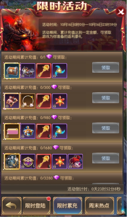 活动简介:活动期间,累计充值达到一定金额,可领取游戏为你准备的返利豪礼
