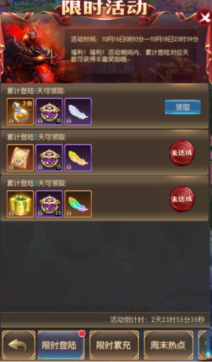累计登陆3天 | 疲劳礼盒,热点*25,神圣之羽 |