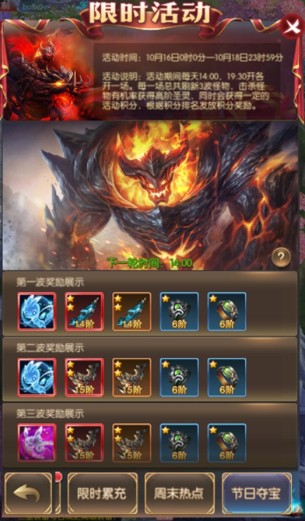 活动简介:活动期间每天14:00,19:30开各开一场。每一场总共刷新3波怪物,击杀怪物有获得高阶圣灵,同时会获得一定的活动积分,根据积分排名发放积分奖励。